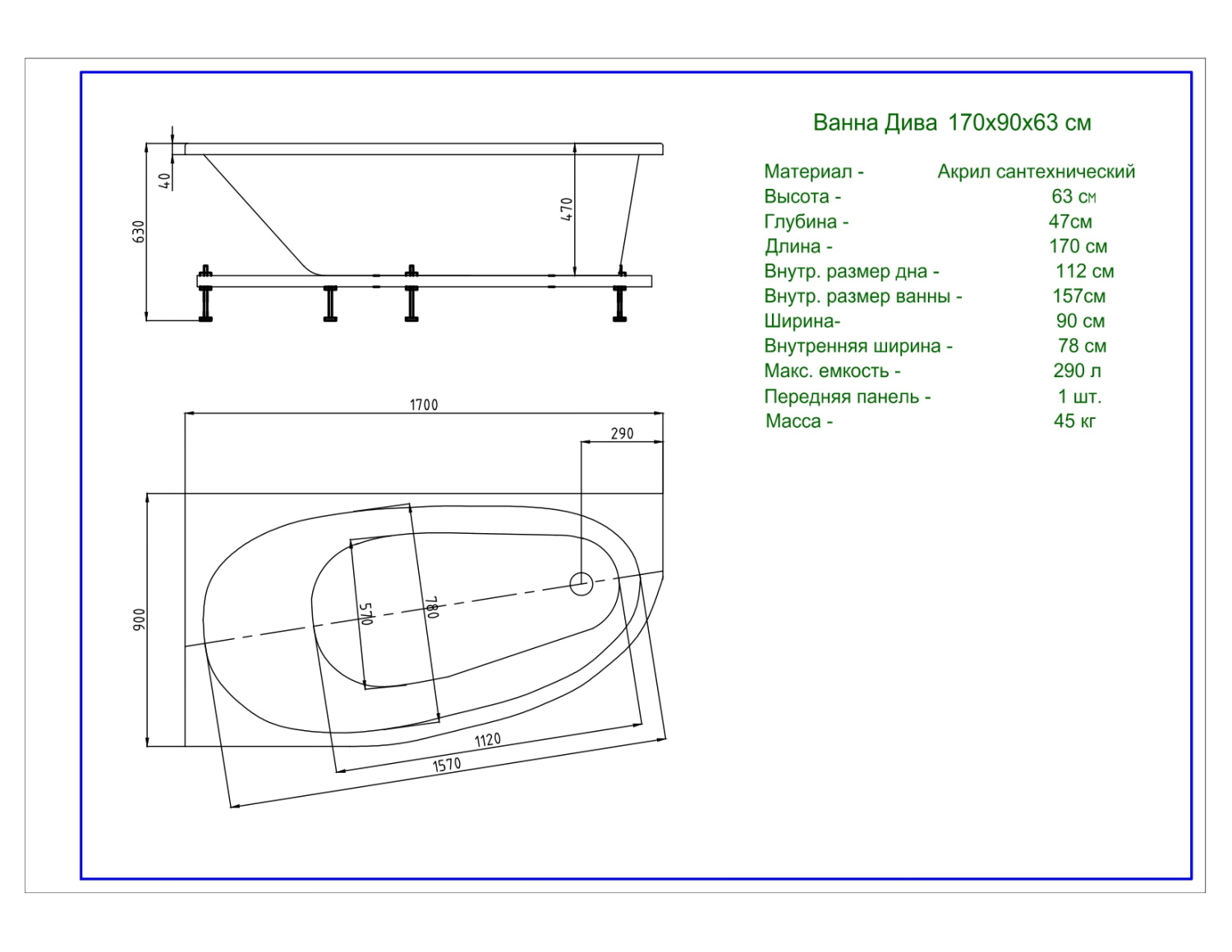 Акриловая ванна Дива 170х90 см, правая, асимметричная, Aquatek