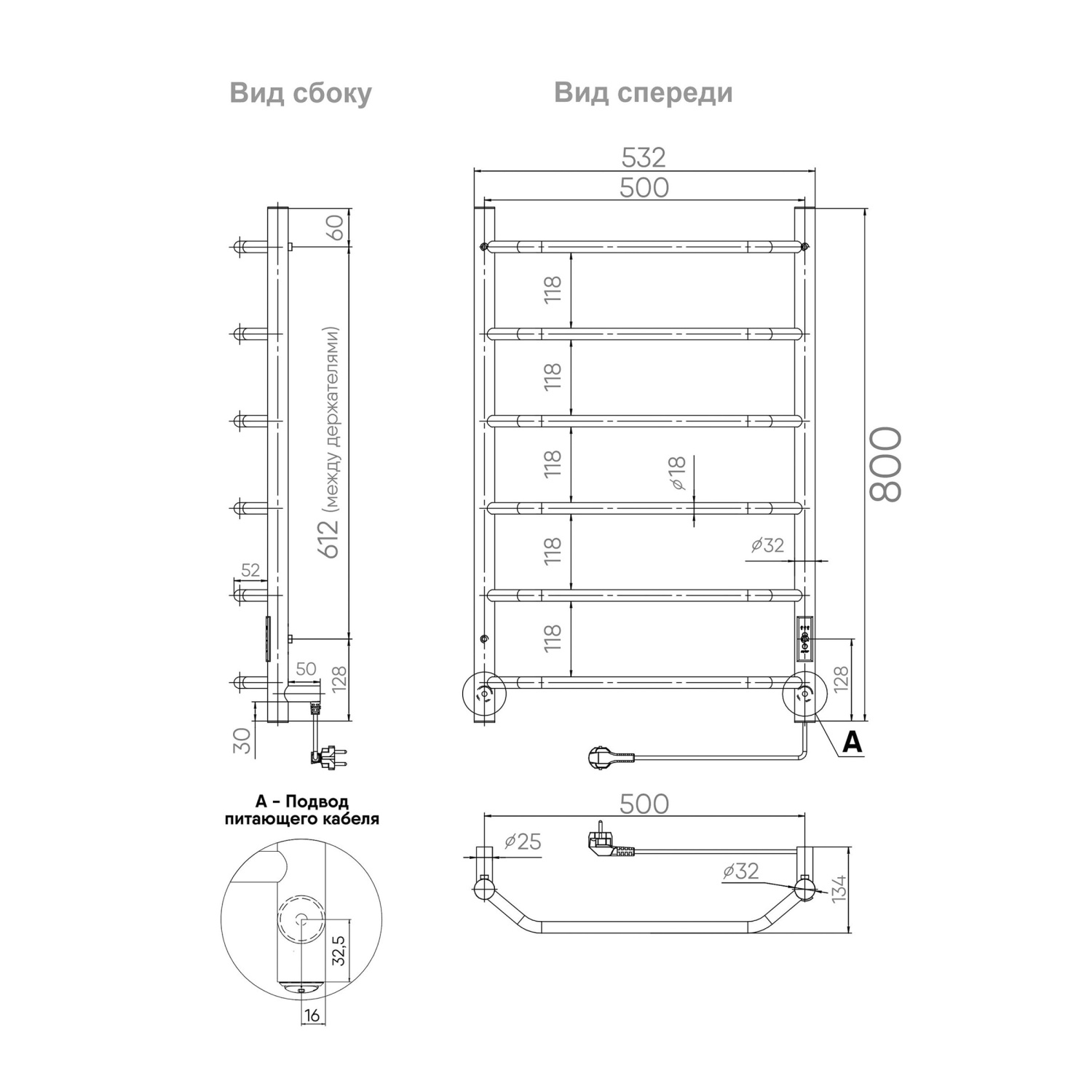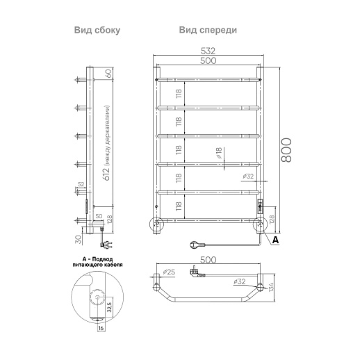 Полотенцесушитель электрический - 1 шт, паспорт изделия - 1 шт, комплект для монтажа - 1 шт, держатель круглый - 4 шт.