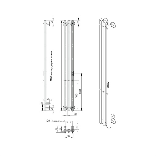 Полотенцесушитель электрический - 1 шт, паспорт изделия - 1 шт, комплект для монтажа - 1 шт, держатель телескопический - 4 шт.