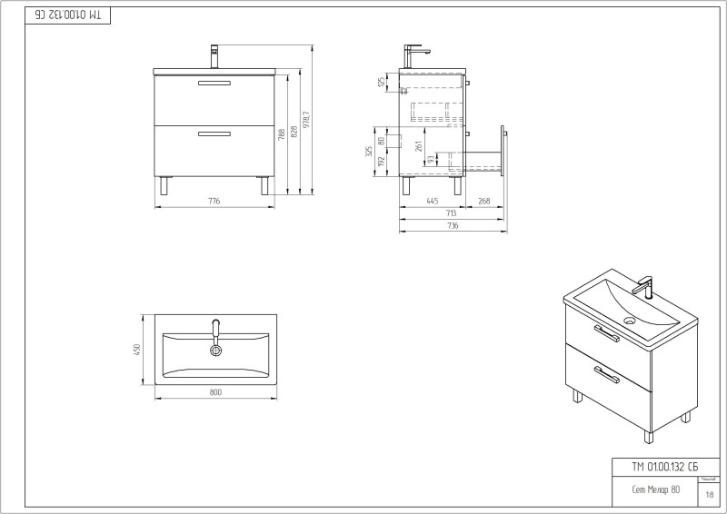 Тумба, раковина, смеситель, ножки 4 шт., кольцо перелива, подводка для воды, крепеж смесителя, ручка для тумбы, гарантийный талон, инструкция по эксплуатации