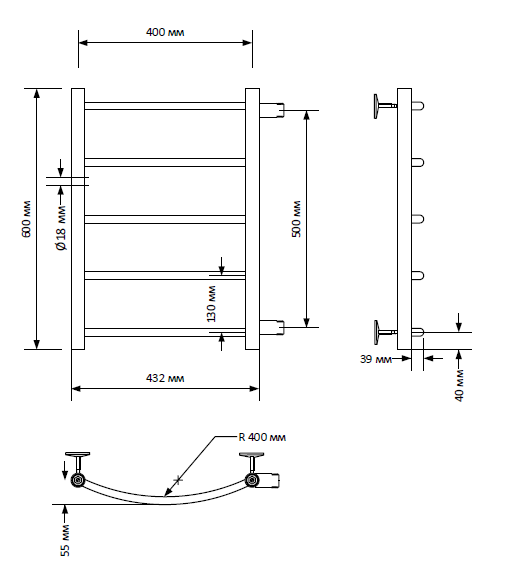 Полотенцесушитель Arc б/п (н.р.1") 60/40 м/о 50 бок.подкл. (к-2, Полиров.) INDIGO