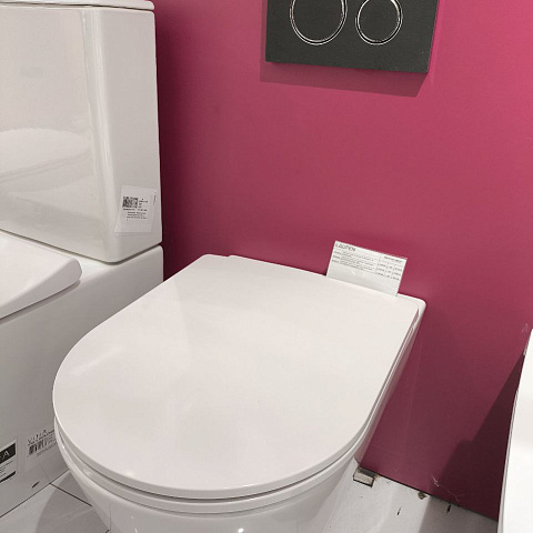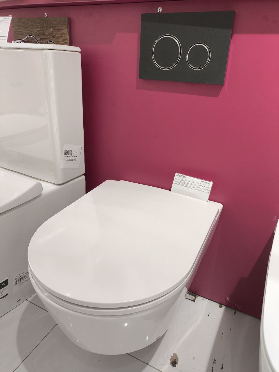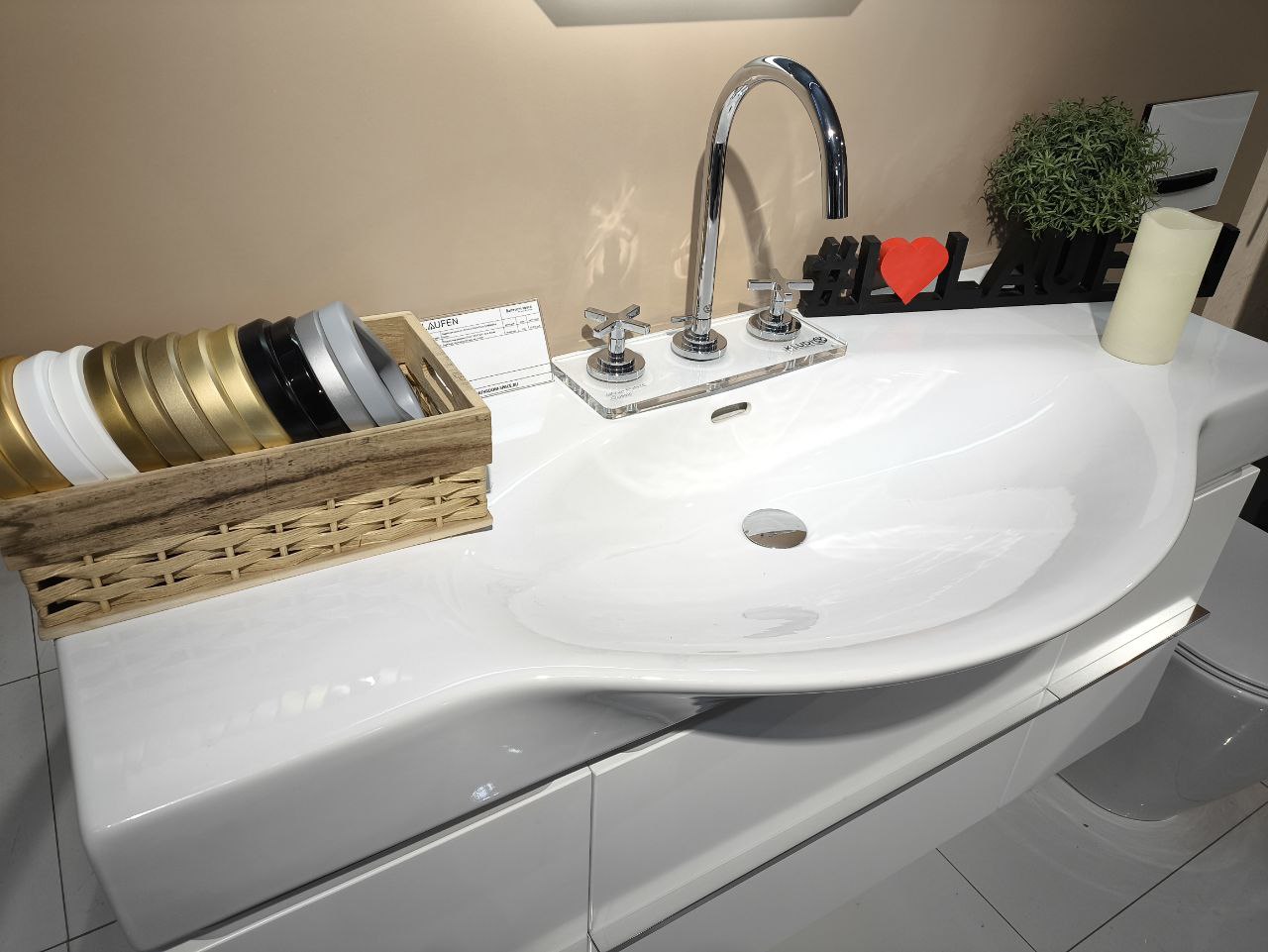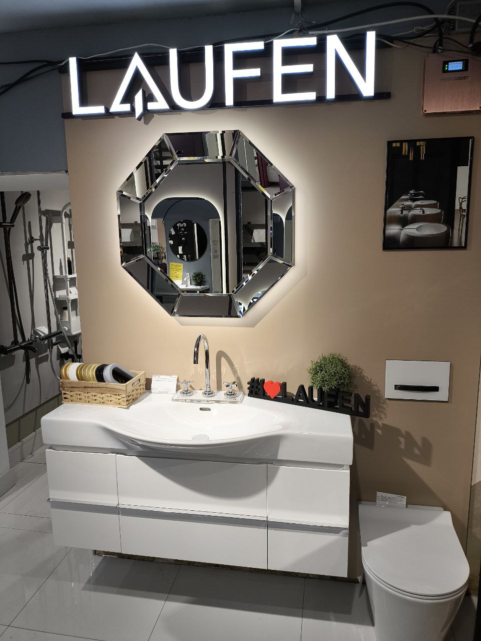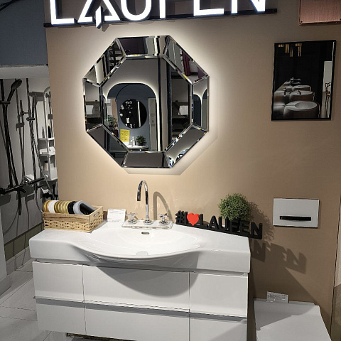 В шоу-руме представлены товары из локальной программы производства: мебель с раковиной Palace и подвесной унитаз Pro.