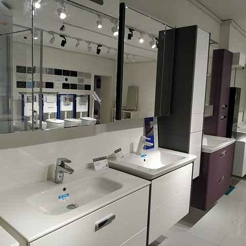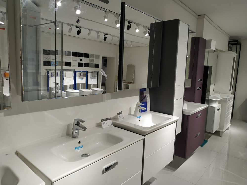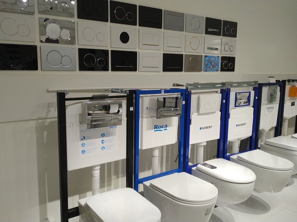 В салоне представлены: системы инсталляции Viega, Grohe, Jacob Delafon, Roca с подключением к воде, мебель для ванной, смесители, напольные унитазы, лейки, шланги и другие аксессуары.